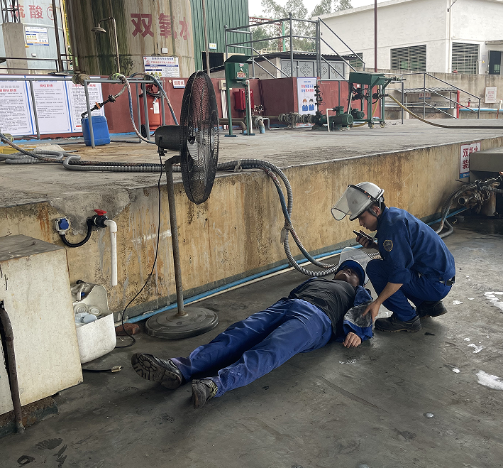 模擬三酸車間充裝人員在作業(yè)過程中挪動(dòng)風(fēng)扇時(shí),濕手不小心觸碰到破損的電纜線導(dǎo)致觸電。附近正在作業(yè)的同事發(fā)現(xiàn)有人觸電后立即大喊:“有人觸電了,有人觸電了”,同時(shí)迅速斷開該電纜線電源開關(guān)。周邊同事聽到后,迅速過來幫助受傷人員躺平,并按照相關(guān)程序及時(shí)上報(bào)。查看傷勢(shì)情況,隨后立即組織人員報(bào)120并對(duì)受傷者進(jìn)行心肺復(fù)蘇,待120急救車到來后,協(xié)助120急救人員抬上急救車并安排人員一同前往,妥善處置。