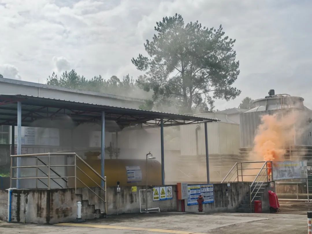 本次演練模擬化工廠液氨儲(chǔ)罐出料管道破裂,導(dǎo)致大量液氨發(fā)生泄漏并引發(fā)火災(zāi)。上午9時(shí)30分,中控室操作員在值班室突然聽(tīng)到氣體報(bào)警器發(fā)生報(bào)警聲,立即查看視頻監(jiān)控,發(fā)現(xiàn)液氨儲(chǔ)罐出料管道冒出大量白煙,且觸發(fā)連鎖噴淋裝置,意識(shí)到液氨發(fā)生泄漏。情況非常緊急,該操作員立即上報(bào)公司應(yīng)急總指揮。